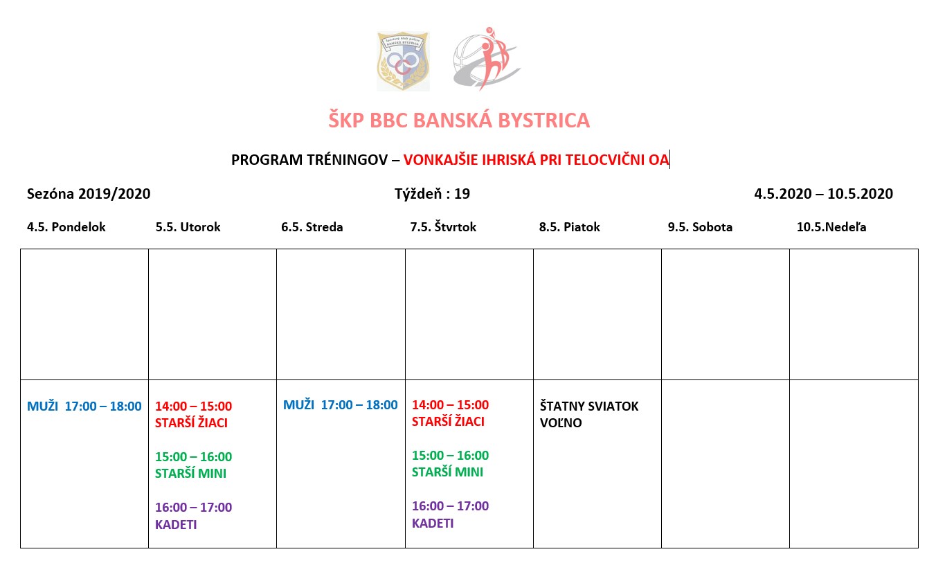 V zmysle nariadenia Hlavného hygienika SR je možné trénovať na vonkajších ihriskách za prísnych podmienok. Maximálne 5 hráčov a tréner, bez verejnosti a rodičov. Osoba, ktorá vedie športovúčinnosť, uchováva záznam o účasti osôb na športovej činnosti v rozsahu meno, priezvisko, dátum a čas účasti na aktivite). Aktívni športovci nemusia mať rúška, treba vykonávať iba bezkontaktné cvičenia, vykonať dezinfekciu rúk a športových pomôcok, samozrejme každý hráč musí mať vlastnú fľašu.Tréningový proces ŠKP BBC bude vedený podľa nasledovných opatrení. Tréningy sa budú konať na vonkajších ihriskách pri telocvični OA. Hráči nemajú prístup do telocvične, šatní ani WC. Preto bude tréningový proces trvať len 1 hodinu.