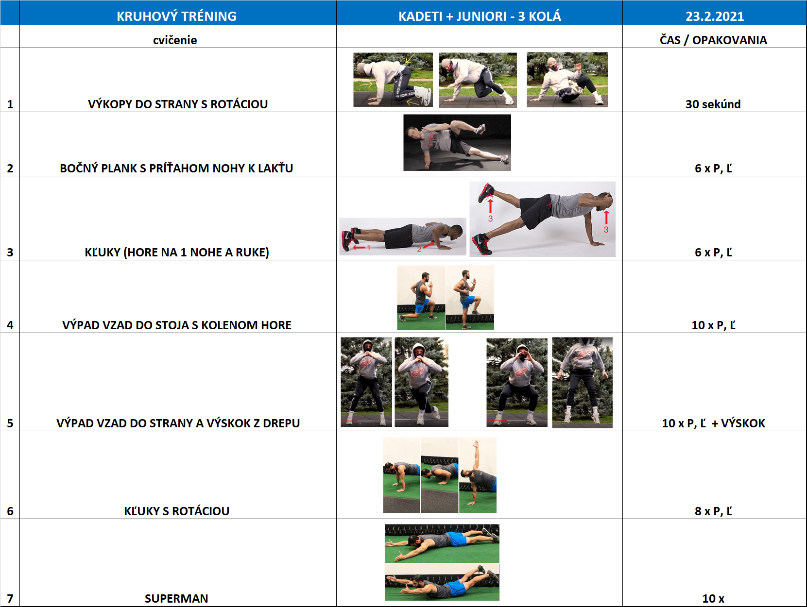 Tréning na utorok 23.2.2021. Družstvo mladších mini sa po prázdninách ľahko zahreje a vykoná strečing a mobilitu. Družstvá kadetov a juniorov po zahriatí absolvujú kruhový tréning.