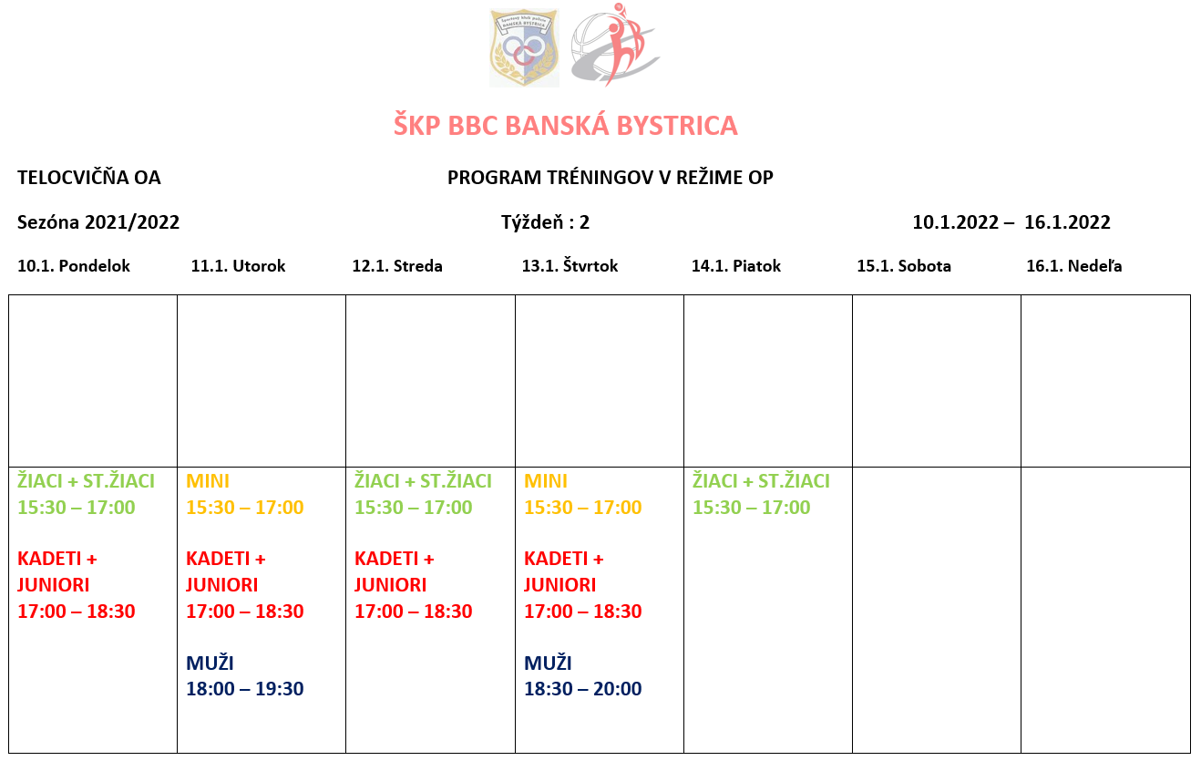 Prinášame Vám program tréningov v 2.kalendárnom týždni: