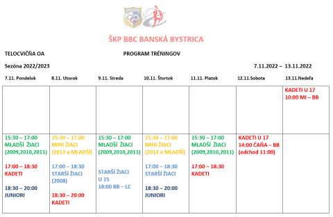 Prinášame Vám program tréningov a zápasov . V stredu 9.11.2022 privítame o 18:00 družstvo Akapo Lučenec, starší žiaci tak pokračujú v zápasovej sérii aj v tomto týždni. Kadeti pocestujú cez víkend odohrať zápasy na palubovkách súperov v Čani a Michalovciach.