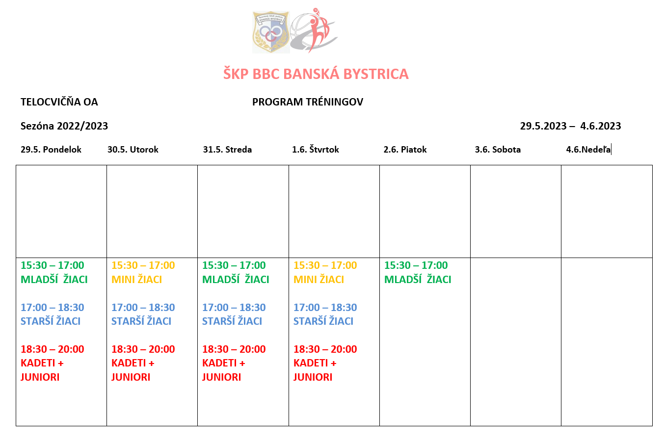 Prinášame Vám týždenný program tréningov na prelome mesiacov máj - jún :